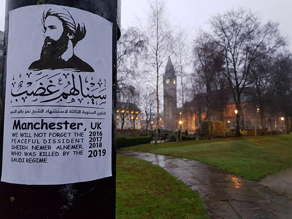 دشنت مدينة مانشستر البريطانية شعار الذكرى السنوية الثالثة لاستشهاد الشيخ نمر باقر النمر "سينالهم غضب"عبر توزيع منشورات في أماكن عامة على مستوى واسع.