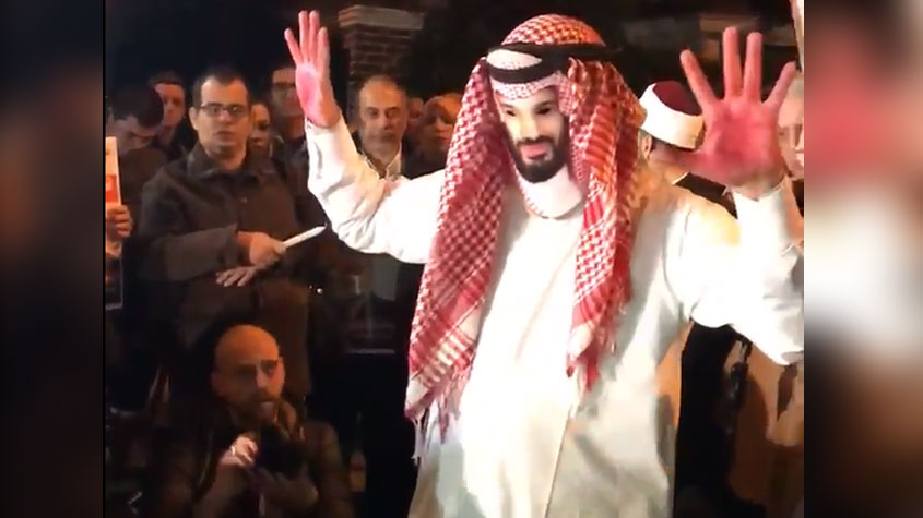 فيما لطخ أحد المشاركين في الوقفة يديه باللون الأحمر ووضع على وجهه قناعا شبيها بوجه ولي العهد السعودي محمد بن سلمان، في إشارة على اتهمه بالتورط المباشر بقتل خاشقجي.