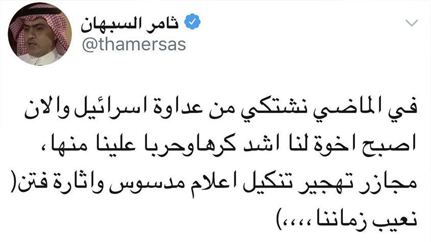 وقارن السبهان، في تغريدة له على موقع التواصل الاجتماعي "تويتر"، بين "عداوة إسرائيل" لبلاده، والأزمة التي تعيشها المملكة ودول خليجية أخرى مع الدوحة، قائلا : "في الماضي نشتكي من عداوة إسرائيل والآن أصبح أخوة لنا أشد كرها وحربا علينا منها" في إشارة لدولة قطر.