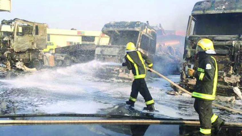 وفاة مقيم حرقًا واحتراق 5 شاحنات وصرافة بنك في تصادم بـ #الشرقية