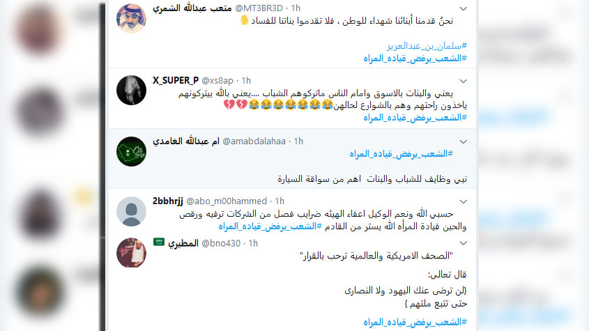 عبر عدد من المغردين من التيار المتشدد في المملكة السعودية عبر موقع التواصل الاجتماعي "تويتر" عن رفضهم للقرار الذي أصدره العاهل السعودي الملك سلمان بن عبد العزيز بالسماح للمرأة بقيادة المرأة للسيارة عبر وسم " #الشعب_يرفض_قيادة_المرأة ".