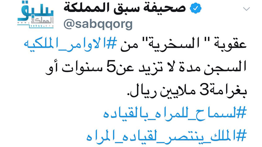 وعمدت جريدة سبق الإلكترونية إلى نشر تغريدة على حسابها الرسمي على "تويتر"، حذرت فيه الساخرين من الأوامر الملكية من السجن 5 سنوات أو غرامة تقدر بثلاثة ملايين ريال.