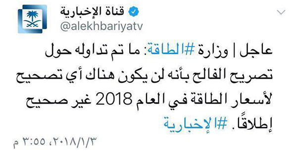 "وقاحة واستخفاف بالشعب.. خالد الفالح صرّح قبل أشهر: "أسعار الطاقة لن تشهد ارتفاعاً في 2018" .. وبالأمس حذفوا هذا التصريح من "واس"، ونشروا خبراً آخر قالوا فيه: خالد الفالح لم يقل هذا الكلام !!! . فعلاً؛ إذا لم تستحِ ؛ فاصنع ما شئت ! "، مرفقا منشوره بتصريح الفالح السابق والنفي له من قبل وزارة الطاقة السعودية