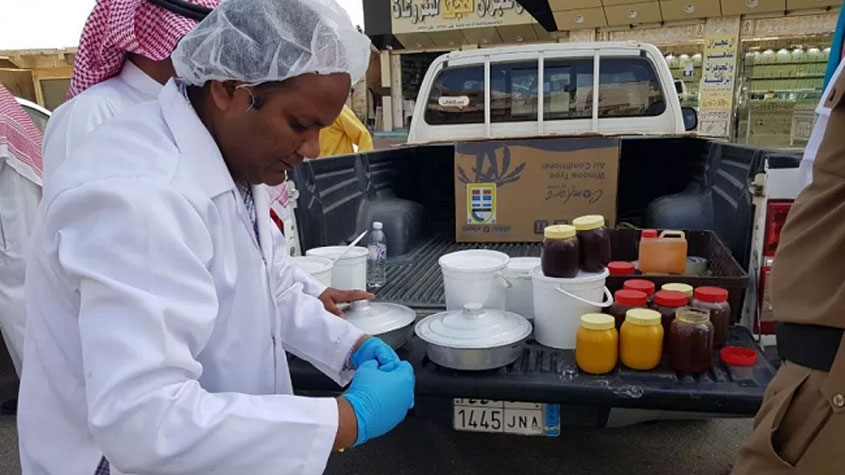شاركت جمعية النحالين التعاونية بمنطقة الباحة بالتعاون مع حملة "وطن بلا مخالف " بجولة ميدانية على سوق السبت الشعبي بمحافظة بلجرشي للكشف عن جودة العسل وفحص العينات للعسل المعروض من قبل الباعة بالسوق في مختبرات الجمعية ، حيث احتجزت الجمعية 620 كليو جراما من العسل, إلى جانب الاحتفاظ على عينات أخرى متخمرة ومخزنة بشكل غير مناسب.