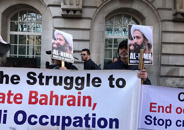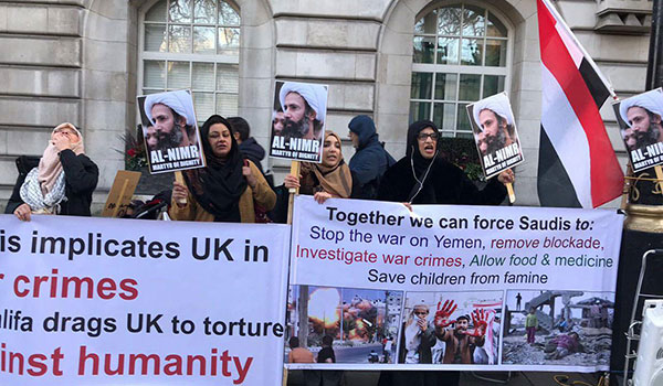 وفي العاصمة البريطانية لندن، أقام نشطاء وقفة احتجاجية للشيخ الشهيد النمر، من تنظيم الجالية البحرينية رفعوا خلالها صور الشيخ الشهيد وصور للجرائم النظام السعودي في اليمن.