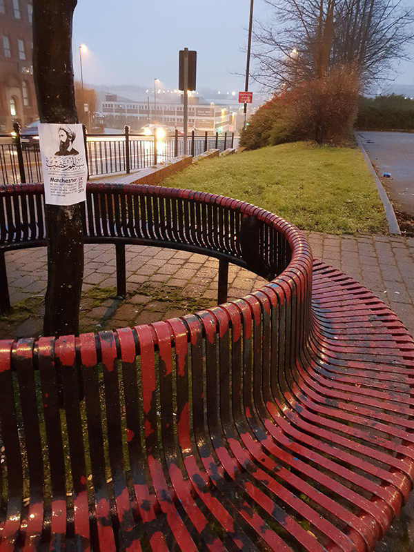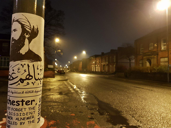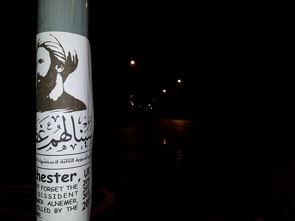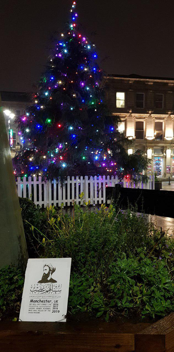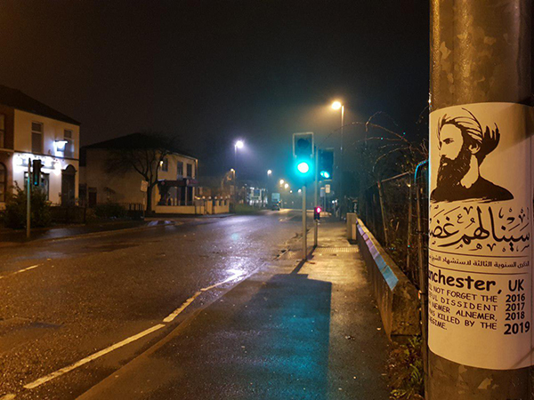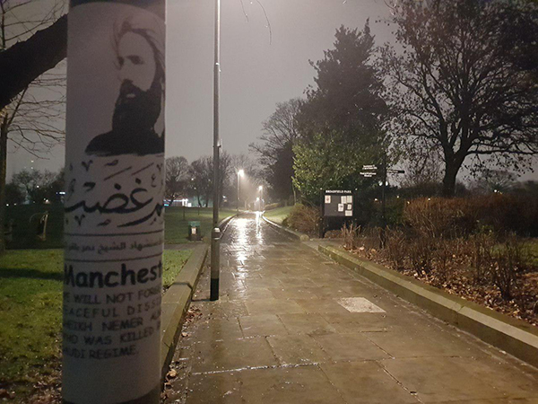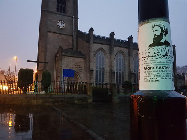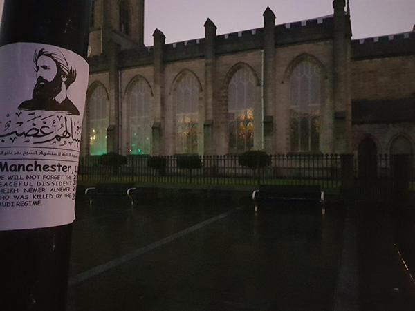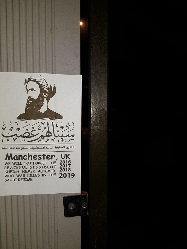 دشنت مدينة مانشستر البريطانية شعار الذكرى السنوية الثالثة لاستشهاد الشيخ نمر باقر النمر "سينالهم غضب"عبر توزيع منشورات في أماكن عامة على مستوى واسع.