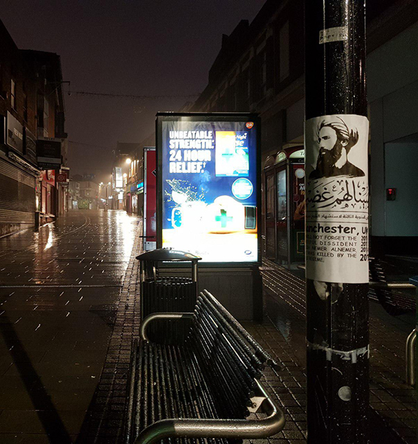 وتم توزيع المنشور في عدد من مناطق مانشستر الحيوية، كالمدينة الإعلامية "Media City UK"؛ للفت نظر الإعلاميين وتذكيرهم بهذه الحادثة، بالإضافك لتوزيع المنشورات عند عدد من الكليات، وبعض المكتبات العامة، ومحطات شبكة القطارات والحافلات، وأمام مقر الحكومة المحلية، وداخل بعض الأحياء السكنية، وعند أشجار أعياد الميلاد المنتشرة في الميادين العامة، وداخل بعض الحدائق والمرافق السياحية، وبجانب بعض المراكز الإسلامية والكنائس المسيحية، وأخيراً في منطقة رشولم "Rusholme" حيث مركز تواجد الجالية العربية.