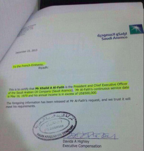 تداول ناشطون سعوديون عبر "تويتر"، صورة لوثيقة تكشف المبلغ الذي يتقاضاه وزير الطاقة السعودي "خالد الفالح" من شركة "أرامكو" فقط، الذي يصل لـ500 ألف دولار سنويا، حسب الوثيقة.