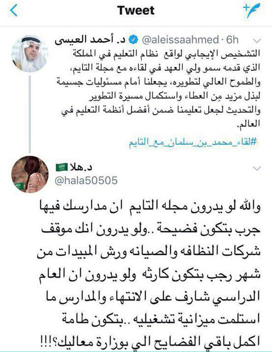 فيما كتب وزير التعليم بحسابه الخاص في "تويتر": "التشخيص الإيجابي لواقع نظام التعليم في المملكة الذي قدمه سمو ولي العهد في لقاءه مع مجلة التايم، والطموح العالي لتطويره، يجعلنا أمام مسئوليات جسيمة لبذل مزيد مِن العطاء واستكمال مسيرة التطوير والتحديث لجعل تعليمنا ضمن أفضل أنظمة التعليم في العالم"، حيث لاقت تغريدته هذه هجوما حاد وسخرية الكثير، لافتين إلى أنه بعيد عن الواقع..