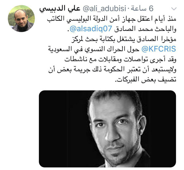 جاء ذلك في تغريدة للدبيسي بموقع ’’تويتر’’، جاء فيها: ’’منذ أيام اعتقل جهاز أمن الدولة البوليسي الكاتب والباحث محمد الصادق @alsadiq07. مؤخرا الصادق يشتغل بكتابة بحث لمركز @KFCRIS حول الحراك النسوي في السعودية وقد أجرى تواصلات ومقابلات مع ناشطات ولايستبعد أن تعتبر الحكومة ذلك جريمة بعد أن تضيف بعض الفبركات’’.