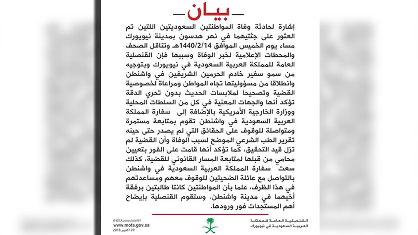 القنصلية #السعودية في #نيويورك تصدر بيانا بشأن وفاة طالبتين سعوديتين