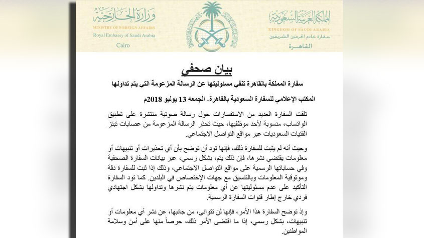 السفارة #السعودية في #مصر ترد على "التحذير" من عصابات تبتز السعوديات