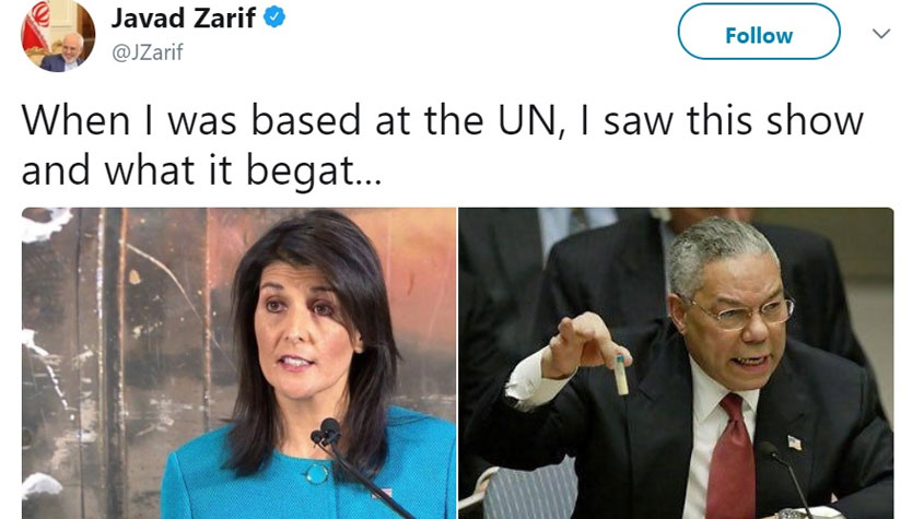 #ظريف يقارن بين كذب #كولن_باول في تدمير #العراق وخطاب #هايلي ضد #إيران