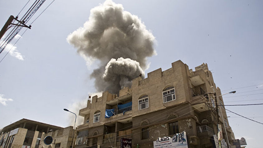 سقوط أربعة شهداء بغارة للتحالف السعودي على قناة تلفزيونية في #صنعاء