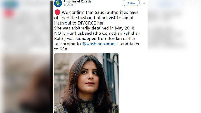 (تغريدة).. السلطات #السعودية تجبر زوج الناشطة #لجين_الهذلول على تطليقها!