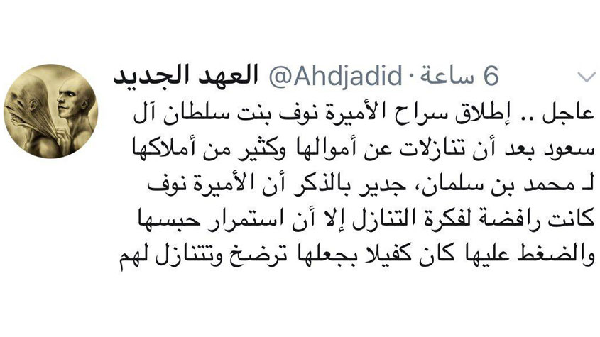 "العهد الجديد": السلطات #السعودية تطلق سراح الأميرة نوف بنت سلطان بعد تنازلها عن أموالها